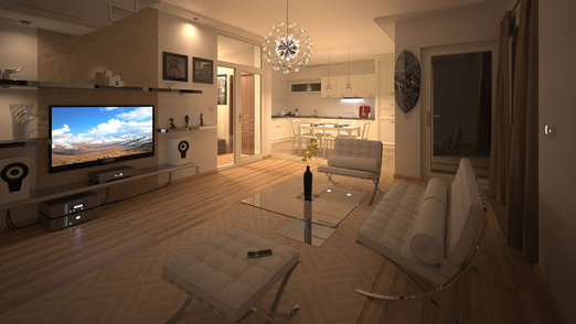 V přízemí se nachází zádveří se šatnou, technická místnost, koupelna, chodba a obývací pokoj, který je propojen s kuchyňským koutem a jídelnou. Z chodby vede schodiště do druhého patra, ve kterém jsou dva dětské pokoje, ložnice, koupelna, WC a terasa vedoucí z ložnice a jednoho dětského pokoje. Součástí každé bytové jednotky je přístupový chodníček, parkovací stání a terasa.