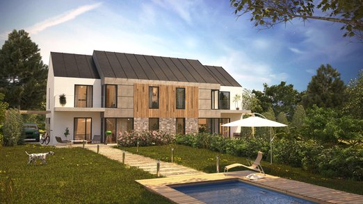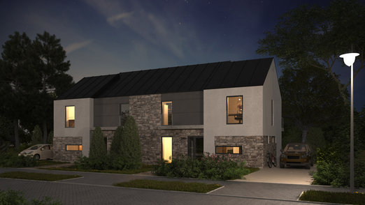 Domy jsou pojaty v moderním stylu. Půdorysný tvar domu je složen ze tří obdélníků, nad kterými je sedlová střecha se zaatikovými žlaby, střešní krytinu tvoří plechové tabule LindabClick. Fasádou jsou dvě barvy omítky v kombinaci s obkladem z kamene a Cetris desek. Domy jsou k dispozici ve dvou variantách. Obě varianty disponují užitnou plochou 130 m², dvěma podlažími a velikostí pozemku 559 – 585 m².